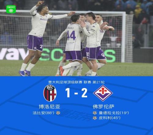 北京时间1月18日,意甲联赛第21轮展开较量,博洛尼亚坐镇主场迎战佛罗伦萨。比赛中,恩杜尔进球被吹,但佛罗伦萨还是率先打破僵局,古德蒙德松送出助攻,曼德拉戈拉破门。随后,皮科利再下一城。比赛进入尾声阶段,乔纳森-罗助攻法比安扳回一城。最终,佛罗伦萨2-1客胜博洛尼亚,取得了保级路上宝贵的3分。